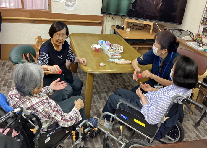 レクリエーションを行います。日によって、プログラムが組まれていますので、スタッフも参加し盛り上げます。その後、ご利用者様とお話をしたり、折り紙や、歌を歌うなど、楽しいひと時を過ごします。